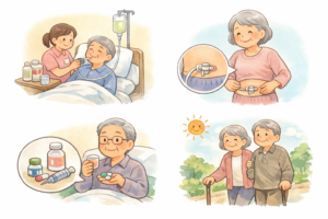 ただし「胃ろう=終末」でも「胃ろう=延命だけ」でもありません。大切なのは、その人の生活の目標(楽に過ごした、リハビリで回復を目指したい、口から少しでも楽しみたい)に合わせて、医師・看護師・リハ職・介護職・家族が同じ方向を見ることです。