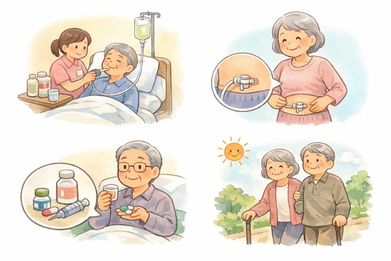 たとえば、食事場面の姿勢、声掛け、食形態の理解、疲労のサイン(集中力低下、咳増加、湿声)に気づくこと。胃ろうは”食べることを奪うもの”ではなく、安全を確保しながら楽しみを支える土台にもなり得ます。