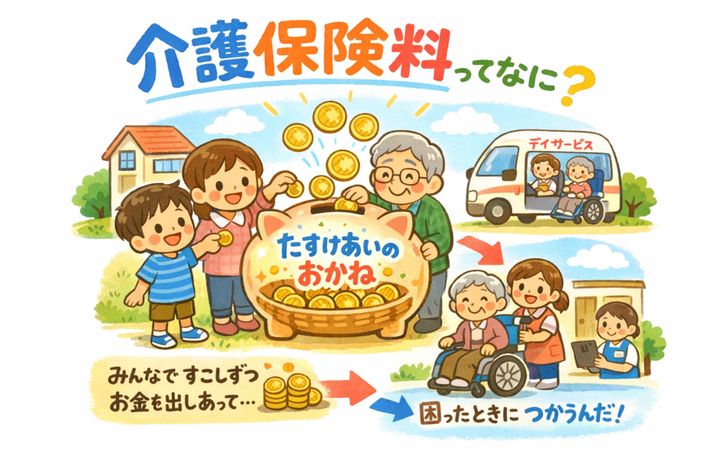 介護保険料は、将来だれかが介護で困ったときに、みんなで助け合うために少しずつ出し合うお金です。